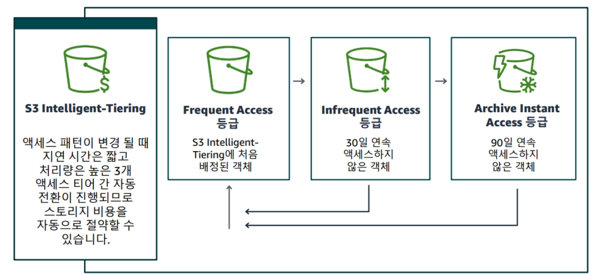 S3 Intelligent-Tiering은 성능에 영향을 주지 않고 데이터 액세스 패턴이 변경될 때 자동으로 스토리지 비용을 절감할 수 있는 유일한 스토리지 등급니다. 이 스토리지 등급에서는 사용 패턴 변화에 따라 데이터가 액세스 티어 간에 이동합니다.