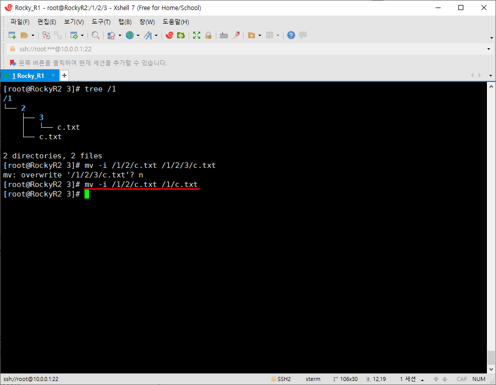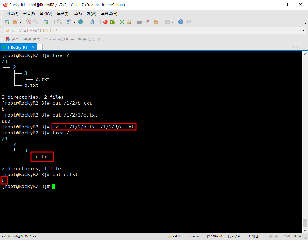 위와는 달리 같은 이름이 있더라도 묻지않고 바로 덮어써 버리는 명령어이다. 다음 사진을 보면 b.txt의 내용은 'b', c.txt의 내용은 'aaa'인것을 확인할 수 있다.