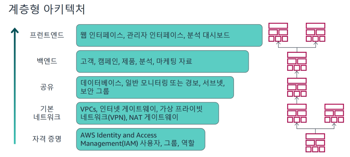 계층형 아키텍처에서는 스택이 여러 수평 계층으로 구성됩니다. 각 계층은 중첩 구축됩니다. 각 계층은 바로 하위 계층에 대한 종속성을 가집니다. 각 계층에 하나 이상의 스택을 포함할 수 있지만, 각 계층 내의 스택은 수명 주기 및 소유권이 유사한 AWS 리소스를 포함해야 합니다.