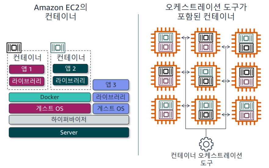 오케스트레이션 도구는 AWS에서 컨테이너를 실행하기 위한 확장 가능 솔루션입니다. 오케스트레이션 도구는 수백 개의 EC2 인스턴스를 포함하여 컨테이너를 호스팅할 수 있는 컴퓨팅 리소스 풀을 사용합니다. 오케스트레이션 도구는 애플리케이션의 수요가 변경됨에 따라 컨테이너를 시작하고 종료합니다. 그리고 컨테이너의 연결을 관리합니다. 또한 컨테이너 배포 및 업데이트를 관리하는 데에도 도움이 됩니다.