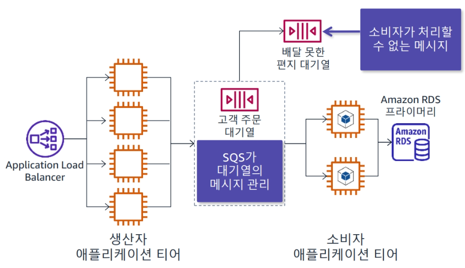 위 예시에서는 생산자 애플리케이션이 고객 주문을 생성한 후 SQS 대기열로 전송합니다. 소비자 애플리케이션 티어가 생산자 애플리케이션 티어의 주문을 처리합니다. 이 애플리케이션은 대기열을 폴링하고 메시지를 수신합니다. 그런 다음 RDS DB에 기록하고 처리된 메시지를 SQS 대기열에서 삭제합니다. SQS는 처리할 수 없는 메시지를 나중에 처리할 수 있는 DLQ(Dead Letter Queue)로 전송합니다. 이 대기열에서 해당 메시지를 나중에 처리할 수 있습니다.