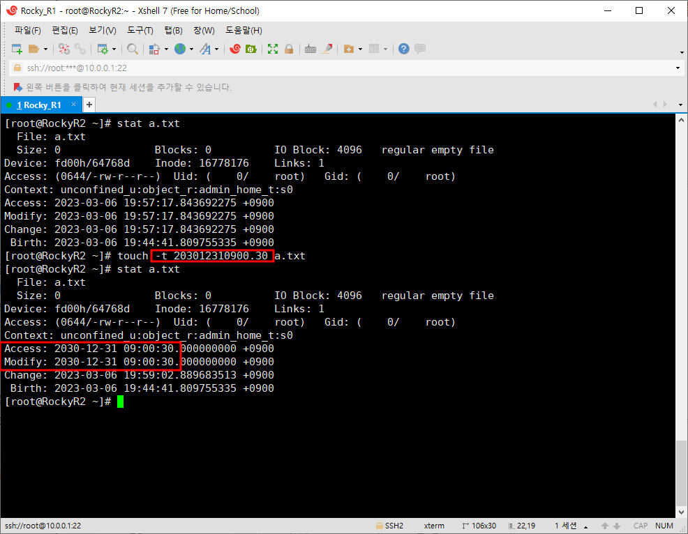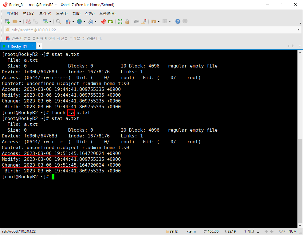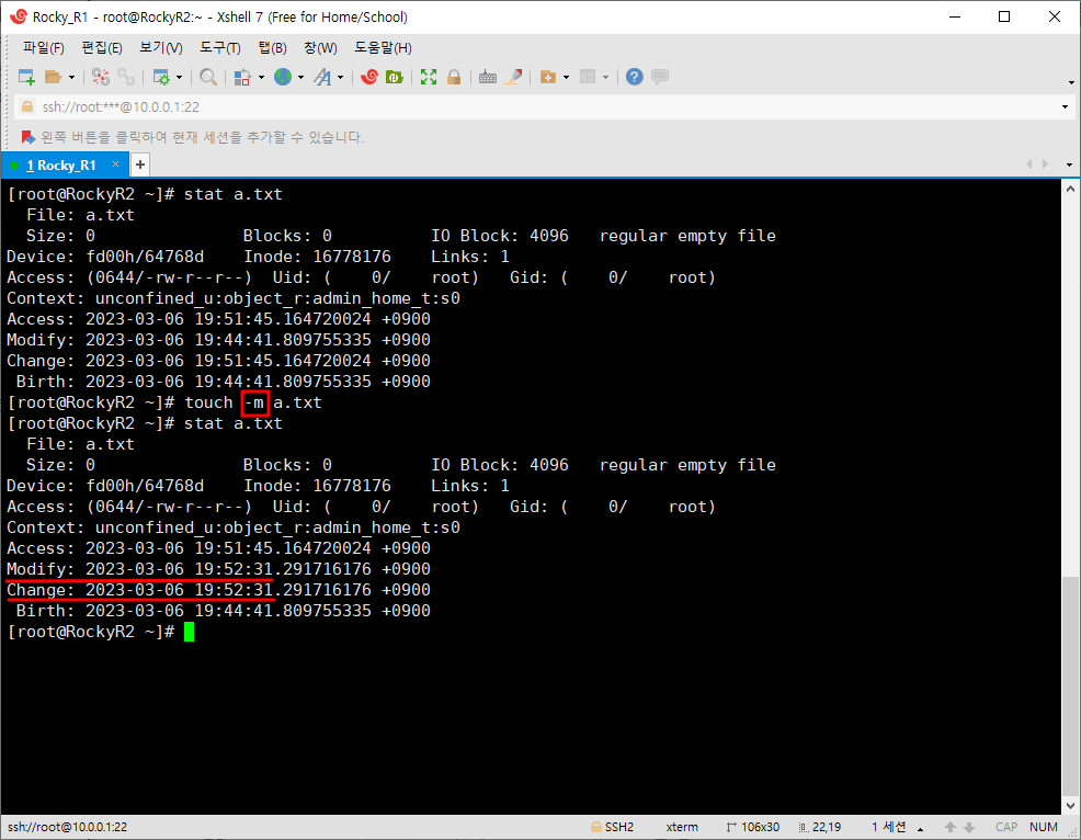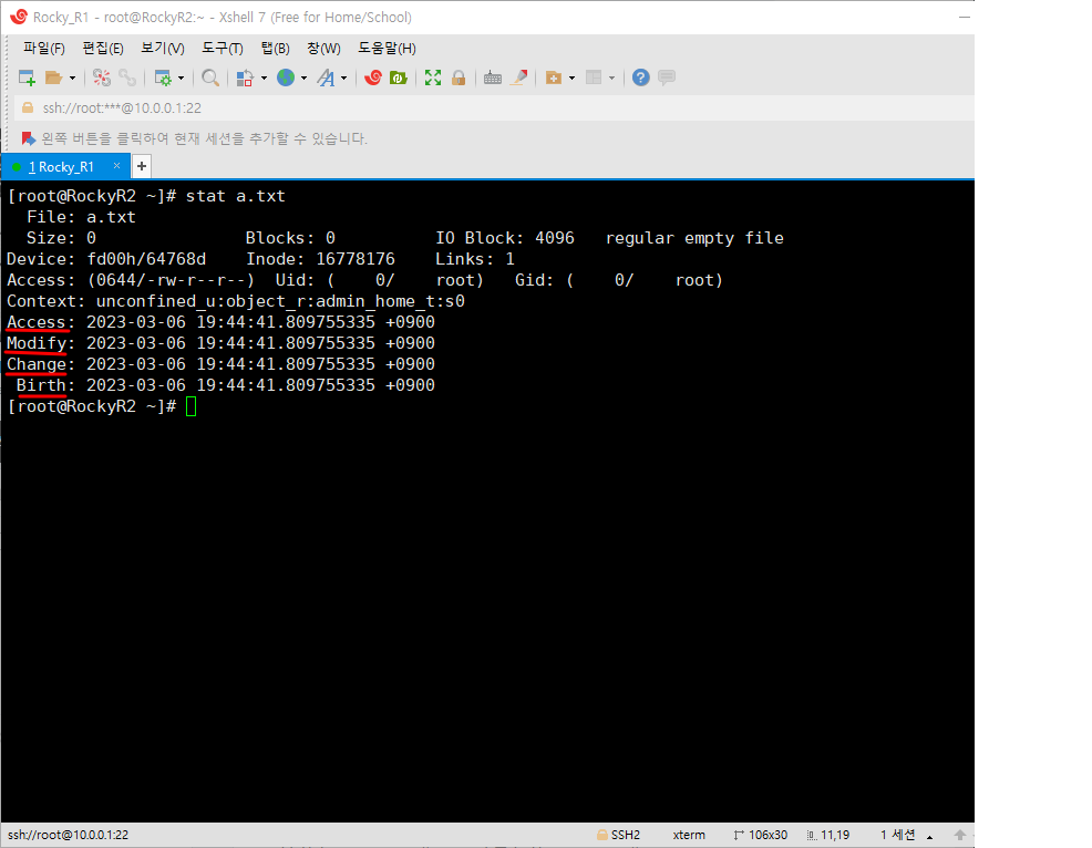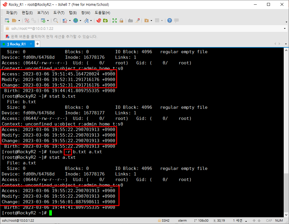 먼저 우리는 이전에 배웠던 stat 명령어를 이용해 touch 명령어를 비교해볼 것이다. 아래에 표시한 시간의 특징은 다음과 같다.