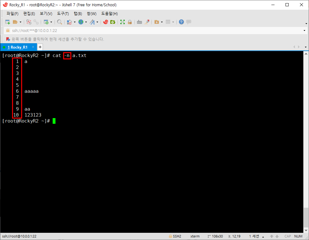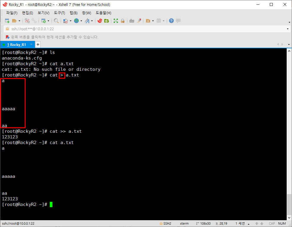 여기 까지 정리하자면 cat은 파일 내용을 보는 명령어이고, > 옵션은 생성, >> 옵션은 추가이다.