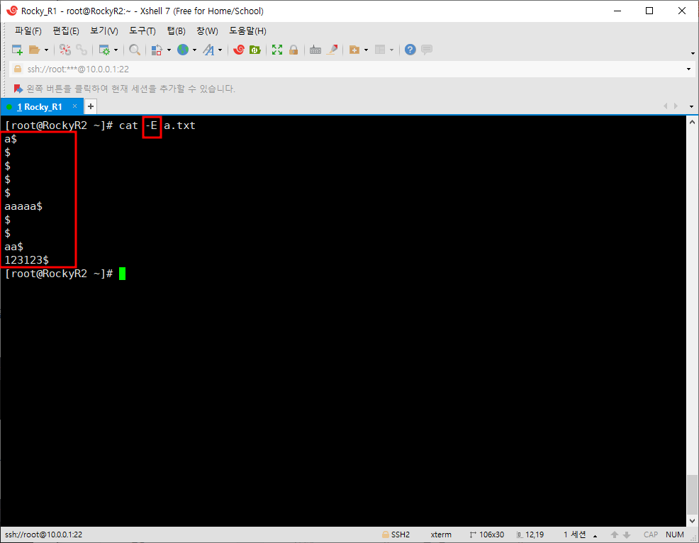 탭 문자를 ^I로, 개행 문자를 $로 표시한다. 이를 통해 파일의 구조를 파악할 수 있다.