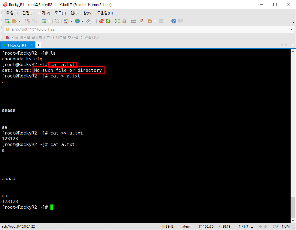 cat은 사실 파일의 내용을 '보는' 명령어이다. 이전 touch에서 생성 말고 다른 것을 했던것을 생각하면 각기 특징을 가지고 있다. 먼저 cat은 파일이 없다면 그 내용을 볼 수 없다.