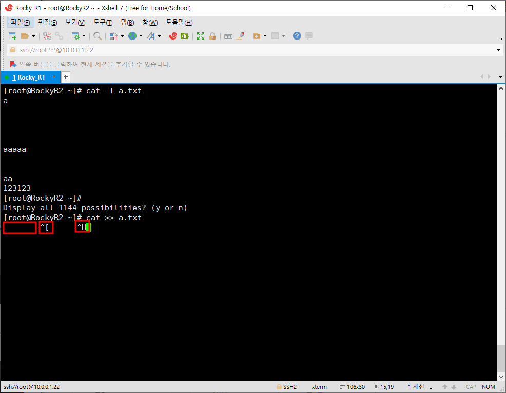 아마 내용을 적거나 추가하다가 잘못 써서 지우려고 했는데 지워지지는 않고 문자만 출력되는 경험을 했을 수 있다. 다음사진은 순서대로 Tab키, Esc키, 지우기키를 눌렀을 때 나오는 모양이다. 이 때 지우고 싶다면 Ctrl을 누루고 지워보면 잘 지워질 것이다.