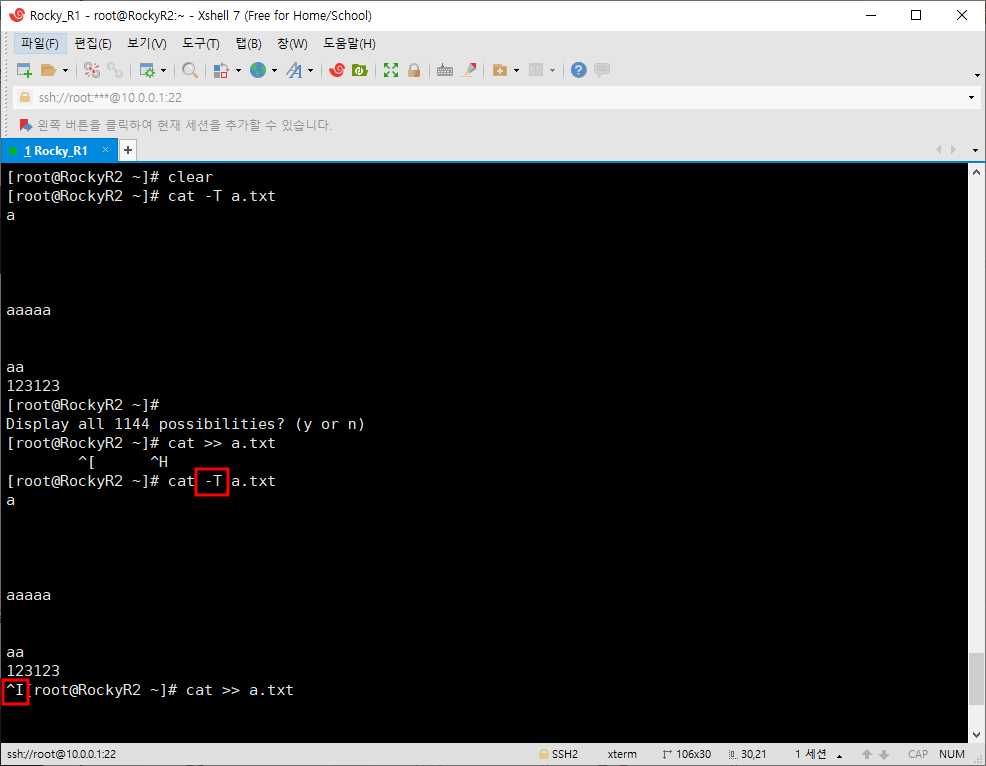 Tab키를 이용해 공백이 발생했다면 다음과 같이 ^I가 표시된다.
