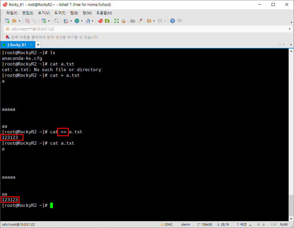 '>>'로 2개를 붙여쓰면 이미 생성돼있는 파일에 내용을 추가할 때 사용한다. 다음 사진을 보면 >> 기호를 이용해 123123을 추가하니 내용 맨 뒤에 추가가 된 것을 볼 수 있다.