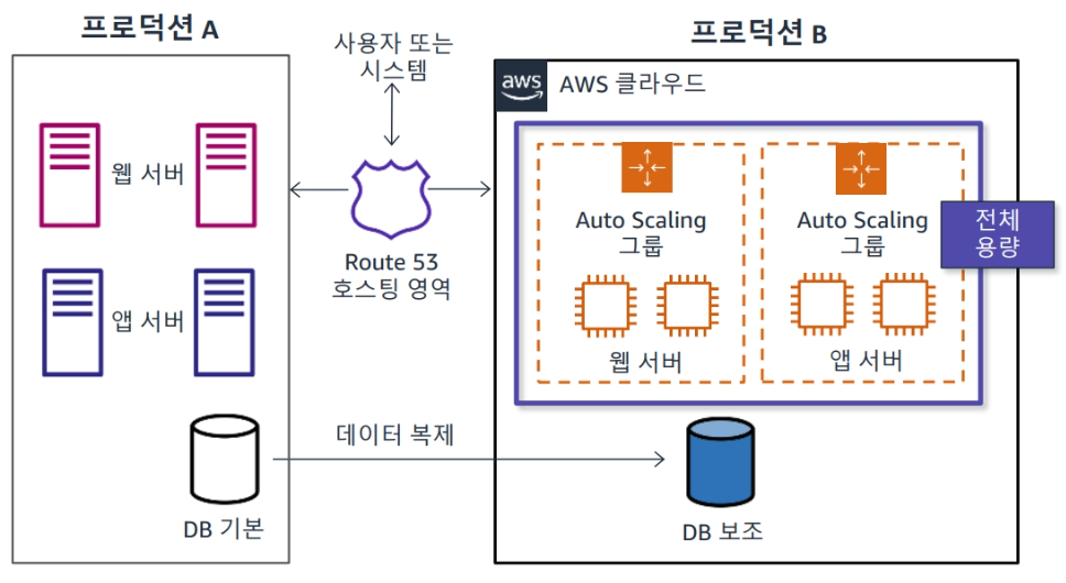 A 환경에서 재해가 발생할 경우 DNS 가중치를 조정하여 B 환경으로 모든 트래픽을 전송할 수 있습니다. 또한, 최대 프로덕션 로드를 처리할 수 있도록 AWS 서비스 용량을 신속하게 증가시킬 수 있습니다. EC2 Auto Scaling을 사용하면 이 프로세스를 자동으로 실행할 수 있습니다. 프라이머리 DB 서비스의 장애를 감지하고 AWS에서 실행되는 병렬 DB 서비스로 이관되기 위해 몇 가지 애플리케이션 로직이 필요할 수 있습니다.
