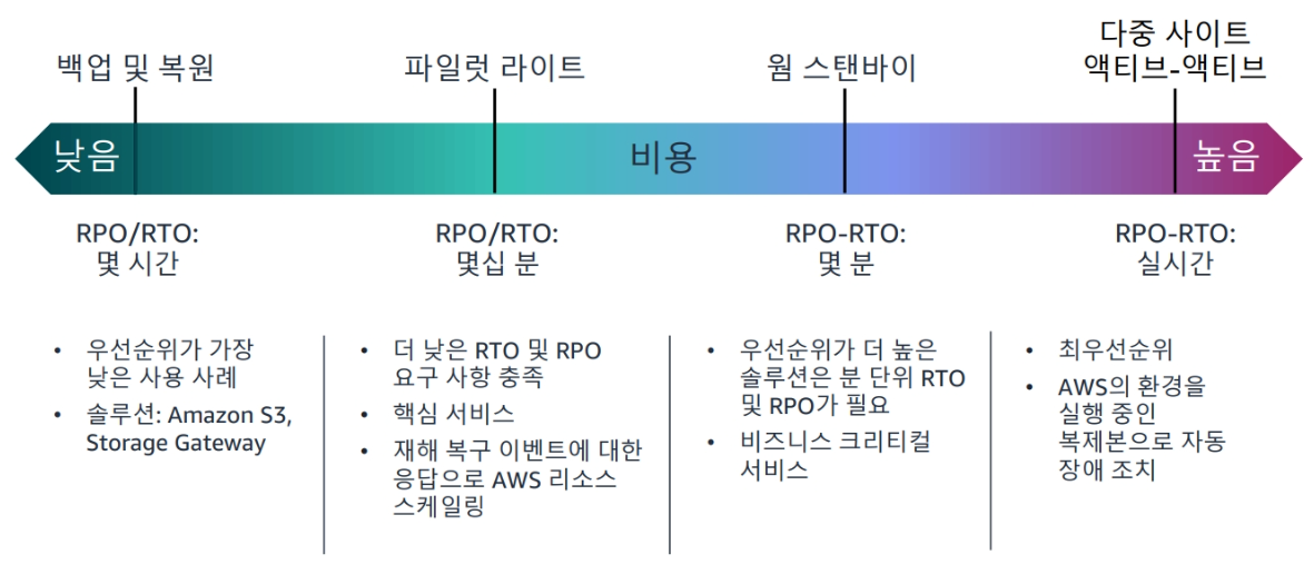 위 그림은 재해 복구 이벤트가 발생한 후 얼마나 빨리 사용자에게 시스템을 사용 가능한 상태로 다시 제공할 수 있는지에 따라 4가지 시나리오로 분류한 스펙트럼입니다. 이 예시는 접근 방식 중 하나일 뿐으로 여러 다른 변형 및 조합도 가능합니다.