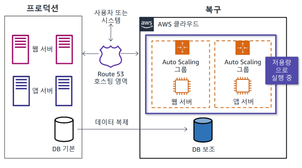 - 프로덕션 환경을 사용할 수 없으면 Route 53은 복구 환경으로 전환합니다. 프라이머리 시스템에서 장애가 발생하면 복구 환경은 자동으로 용량을 확장합니다.