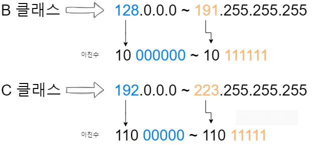B와 C 클래스도 이처럼 나타낼 수 있습니다. B 클래스는 첫 옥탯을 이진수로 나타냈을 때 10 000000 ~ 10 111111까지이며 이는 128~191까지를 나타냅니다. C 클래스는 110 00000 ~ 110 11111로 192~223까지 입니다.