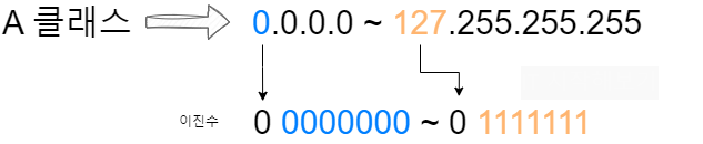 A 클래스는 맨 앞 옥텟 주소가 0~127 범위입니다. 즉, 2진수로 풀었을 때 맨 앞 자리가 0인 주소가 A 클래스입니다. 하지만 0은 네트워크 ID로 사용되고, 127은 자신을 의미하는 루프백(Loopback) 주소로 사용되므로 제외됩니다. 때문에 실제로 사용가능한 주소는 1.0.0.0 ~ 126.255.255.255 입니다.