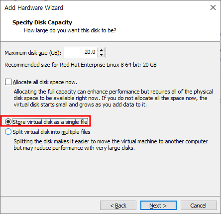 멀티플 파일은 가상화 장치 파일을 2G 단위로 나누기 위한 옵션으로 눈에 띄는 성능저하가 있다고 하니 single로 선택해준다.