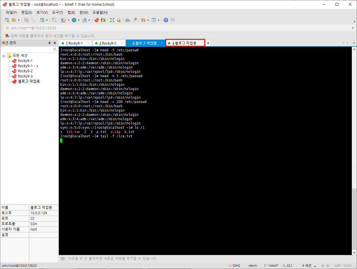 tail 명령어 사용법은 head와 동일하나 추가로 -f 와 -F옵션이 있다. -f는 해당 파일의 끝부분을 계속 출력하고 변화가 있으면 그 내용을 출력한다. -F는 마찬가지로 끝부분을 계속 출력하고 파일이 삭제되거나 변경되면 알려준다. 이번에는 내용이 없는 a.txt를 가지고 실험해볼 것이다.