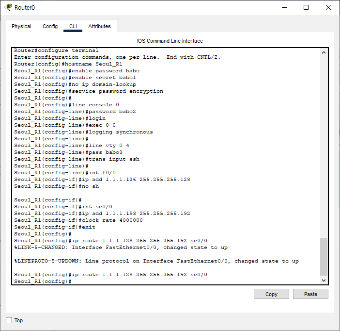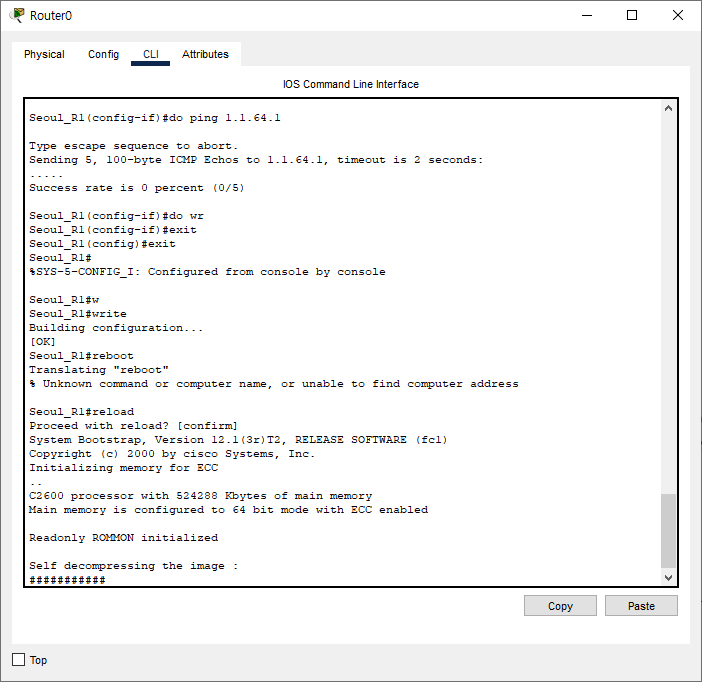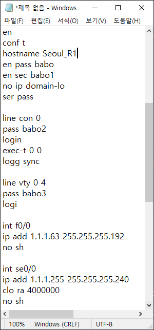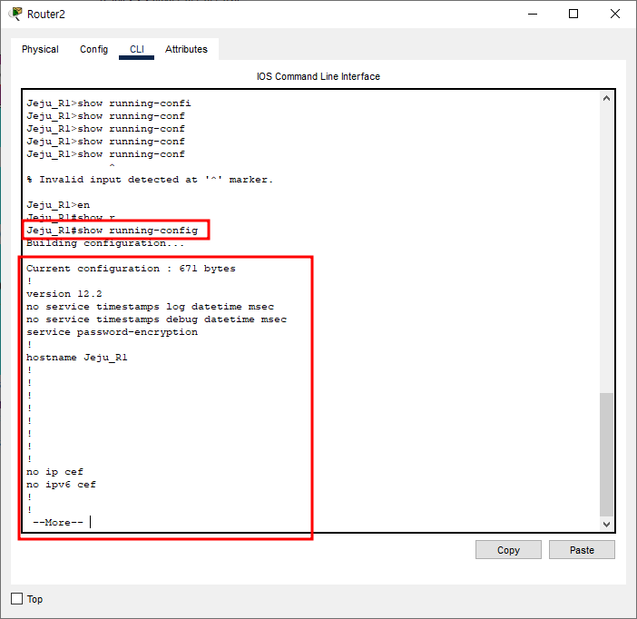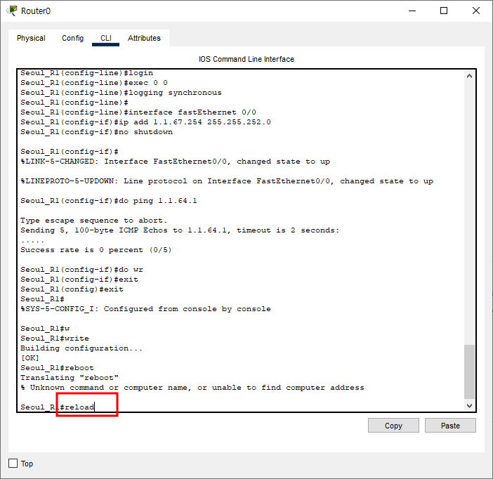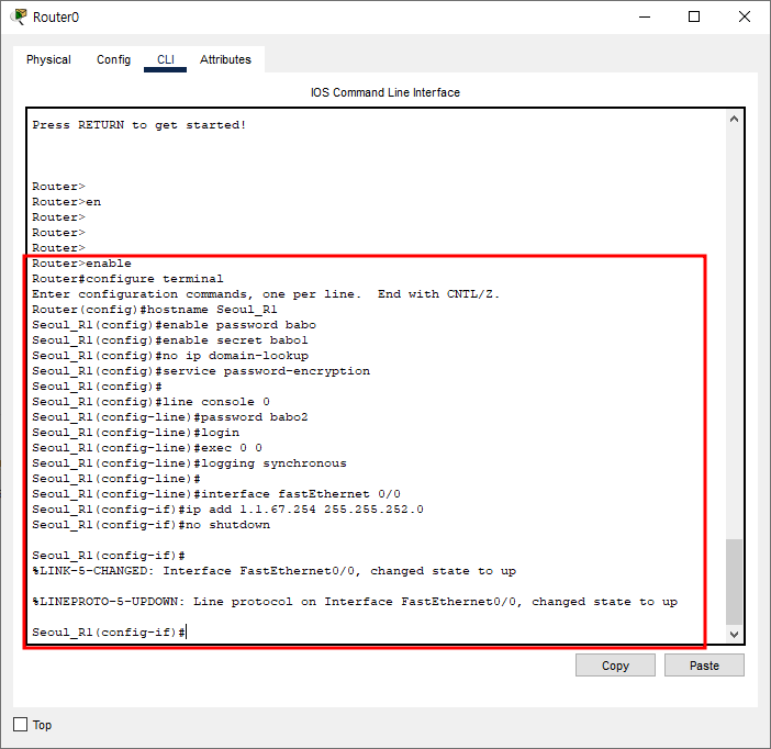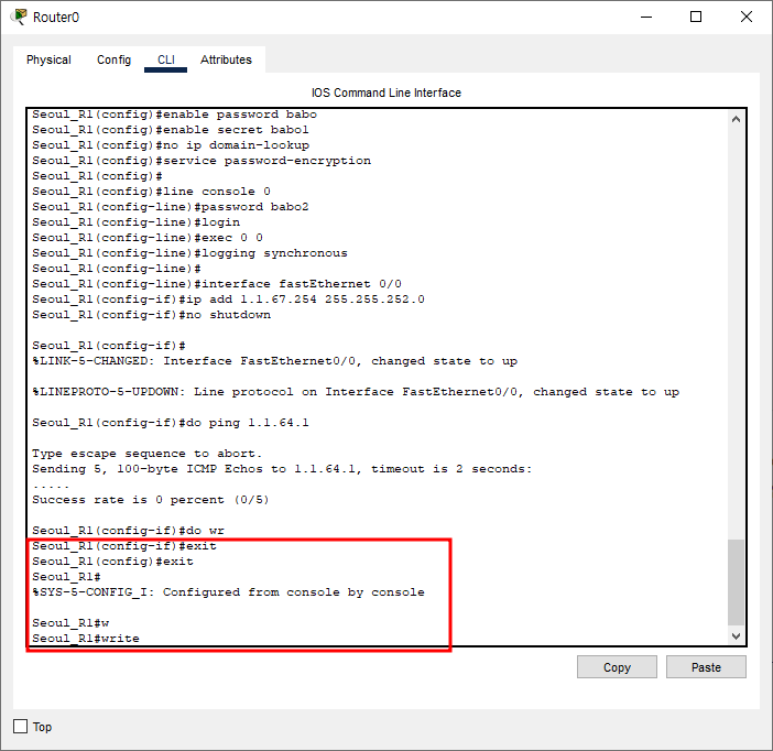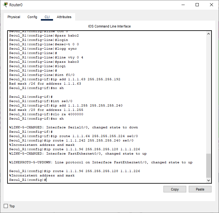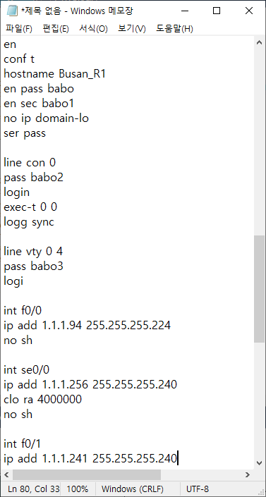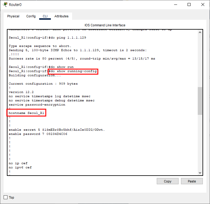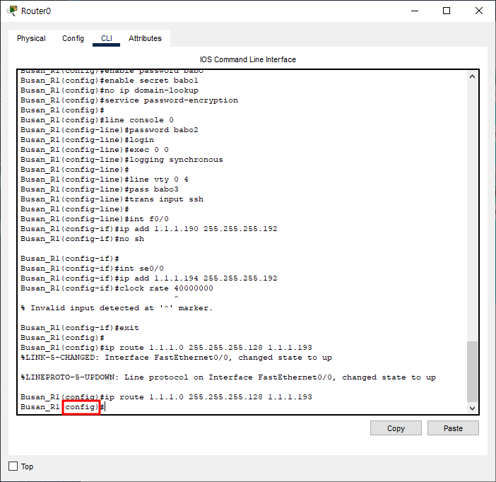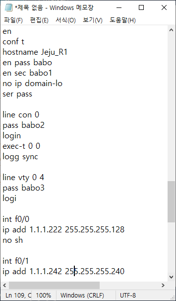 여전히 안된다. 이 때에는 2가지 방법이 있는데 명령어를 적어 놓은 메모장을 들여다 보며 수정하고, 라우터를 초기화한 후 다시 붙여넣거나, 지금 상태를 볼 수 있는 명령어를 입력해 확인해가면서 변경하는 것이다.
