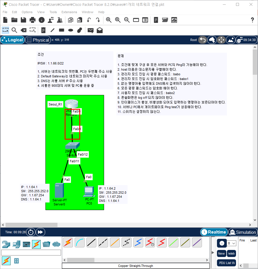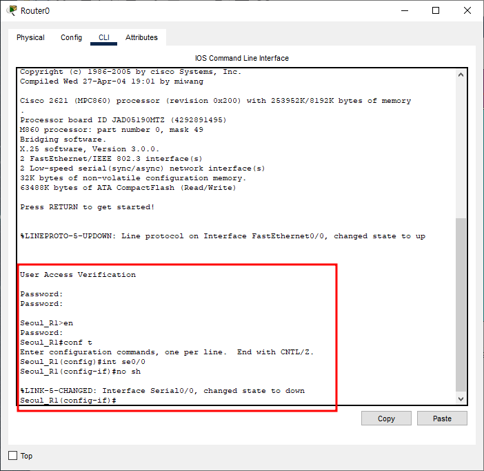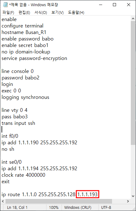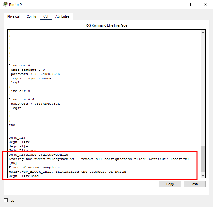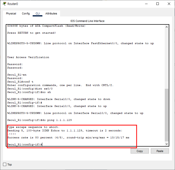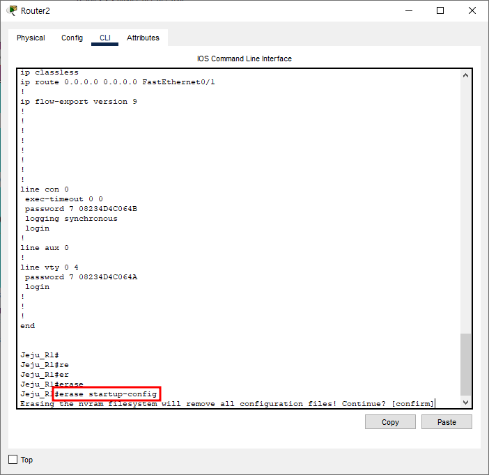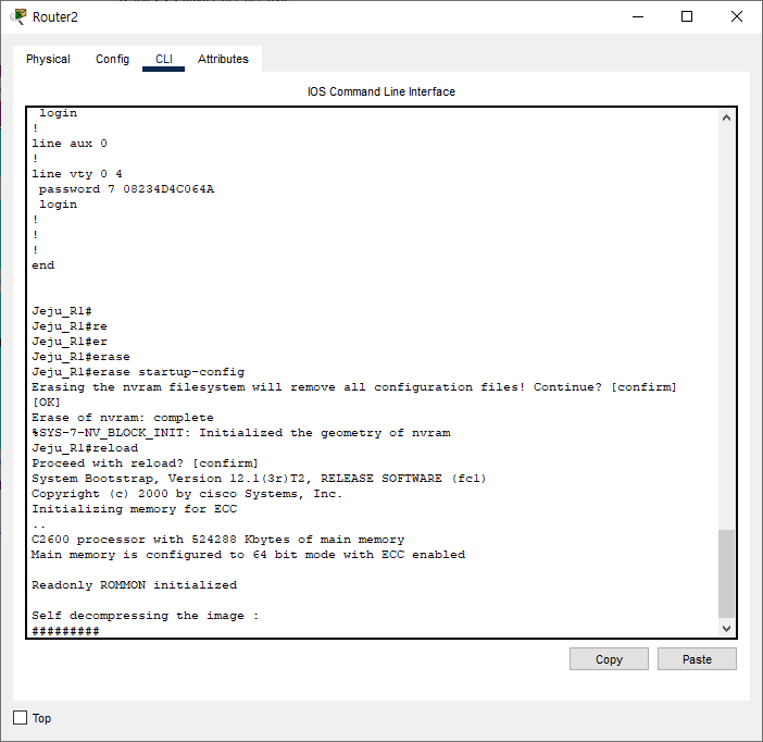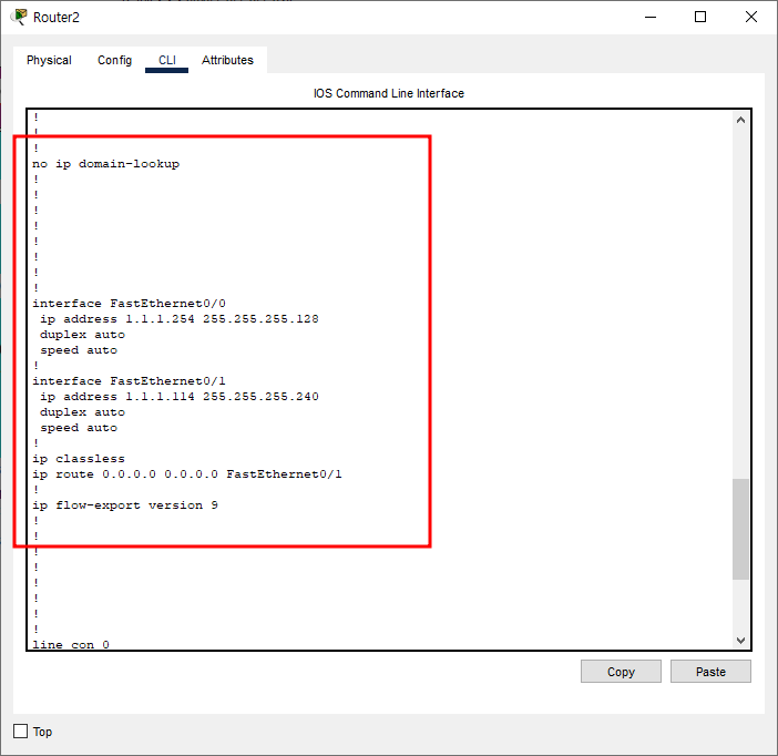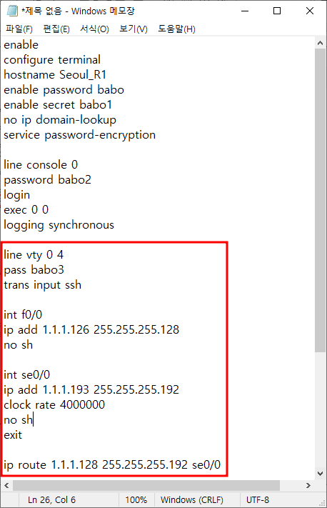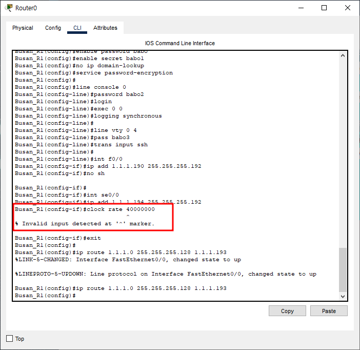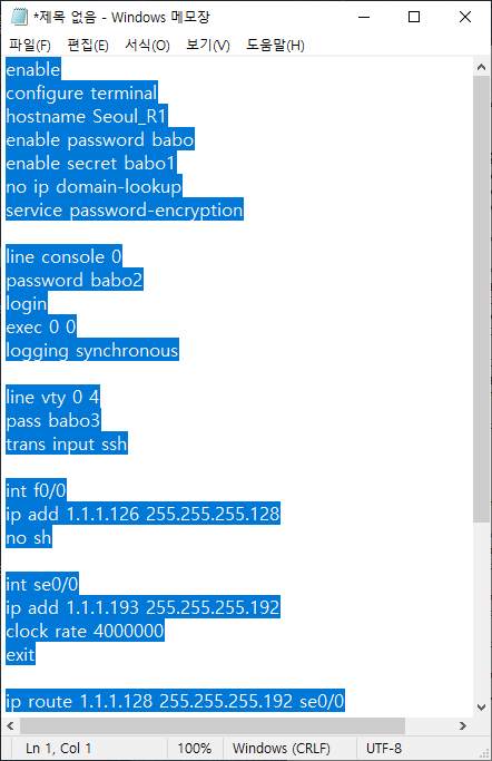 여전히 안된다. 이 때에는 2가지 방법이 있는데 명령어를 적어 놓은 메모장을 들여다 보며 수정하고, 라우터를 초기화한 후 다시 붙여넣거나, 지금 상태를 볼 수 있는 명령어를 입력해 확인해가면서 변경하는 것이다.