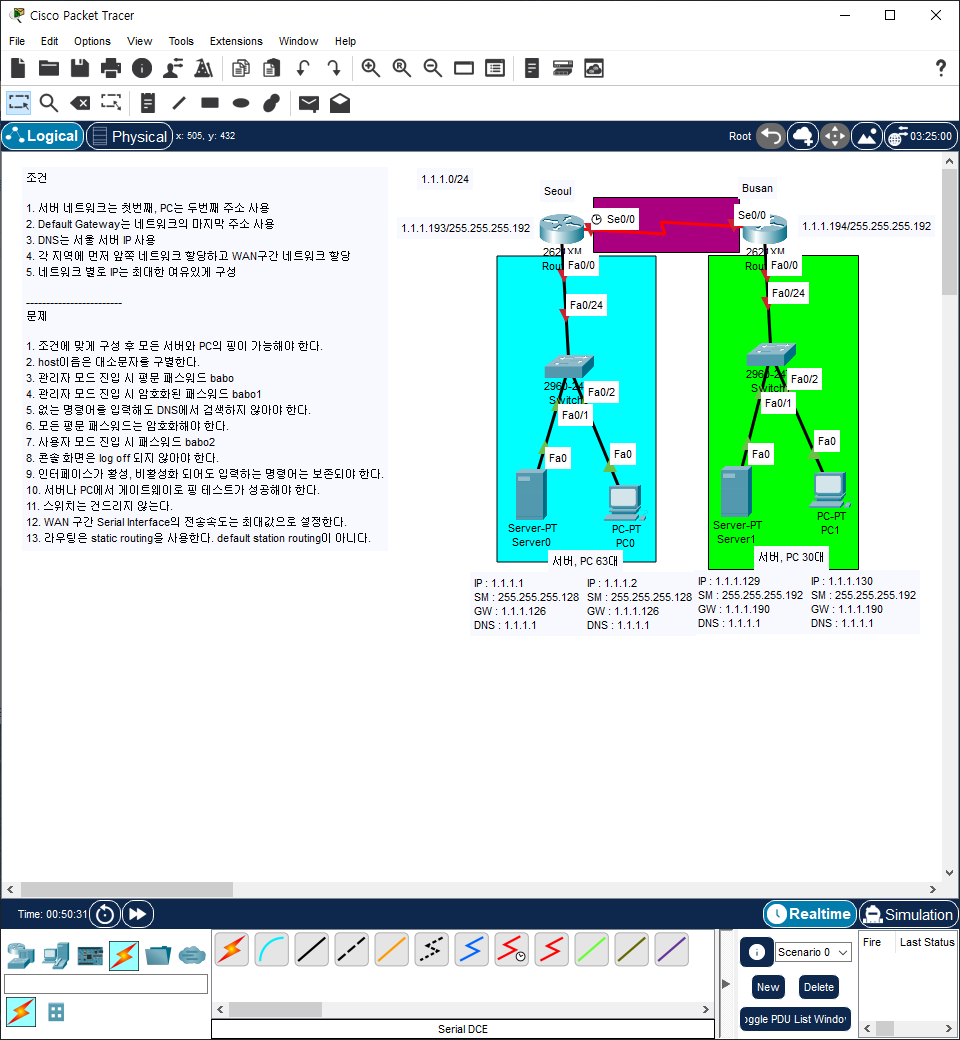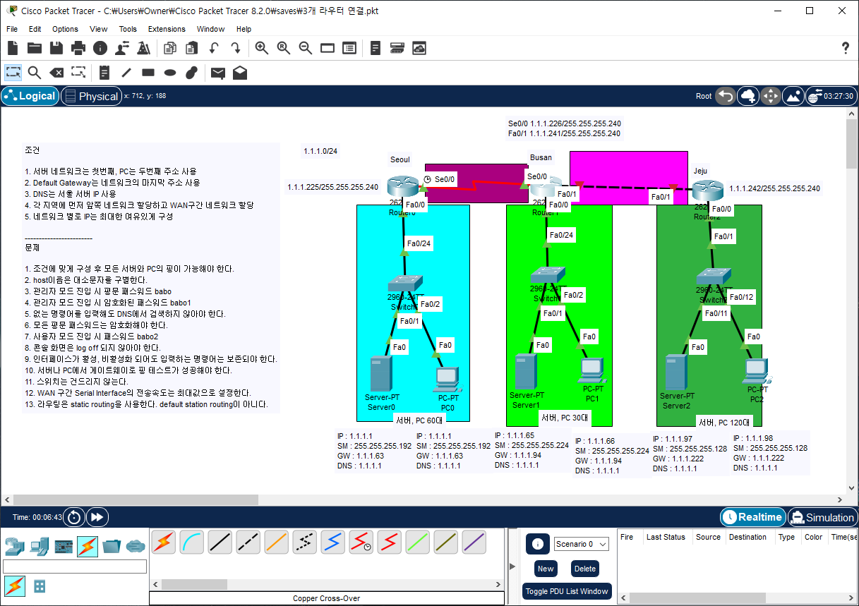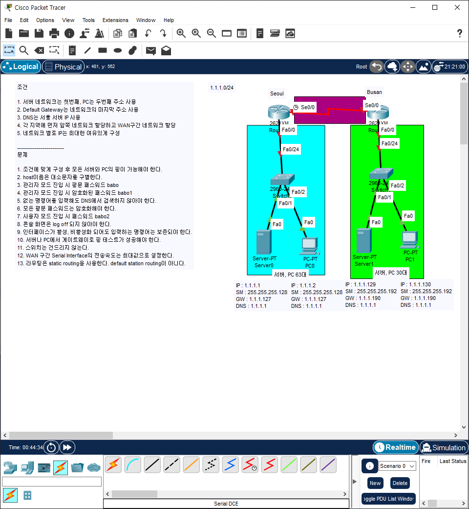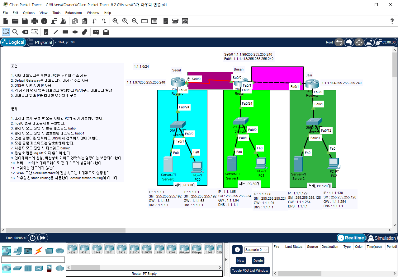 서울의 서브넷 마스크는 255.255.255.192로 62대 수용 가능하고, 부산은 255.255.255.224로 30대 수용이 가능하다. 이번에 추가한 네트워크에는 255.255.255.128로 총 126대가 수용 가능하다. 나머지 라우터끼리의 연결은 255.255.255.240으로 14개씩 수용 가능한 네트워크로 만들었다.
