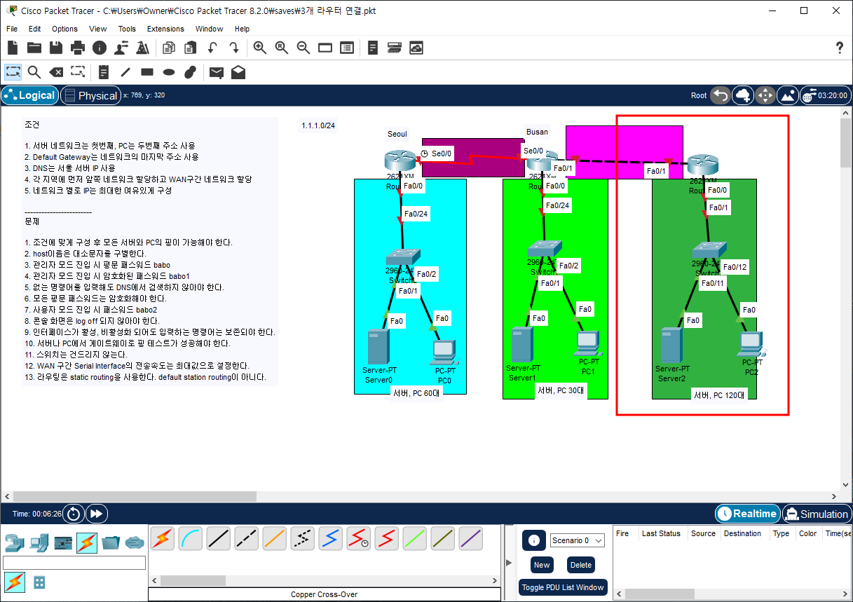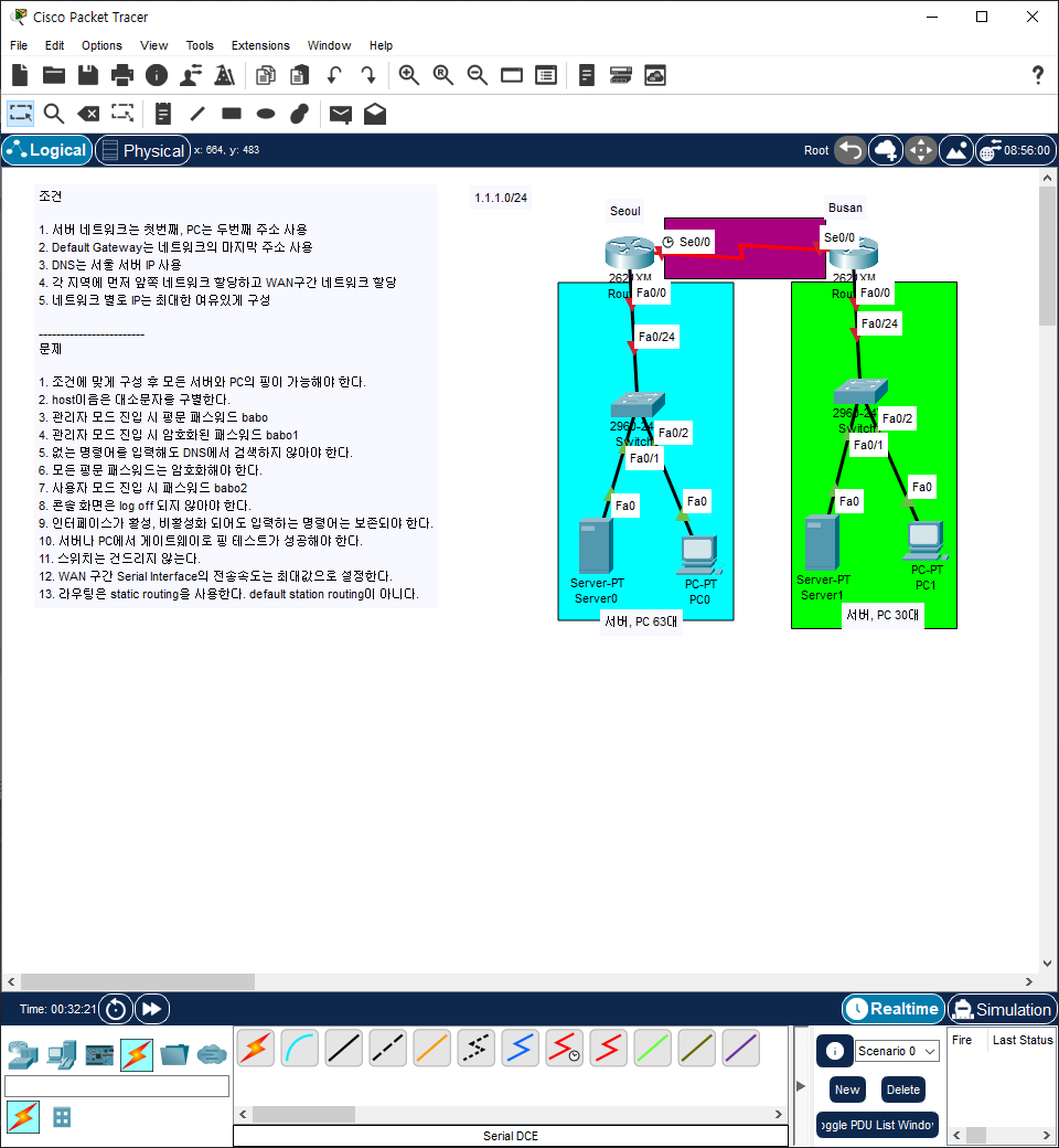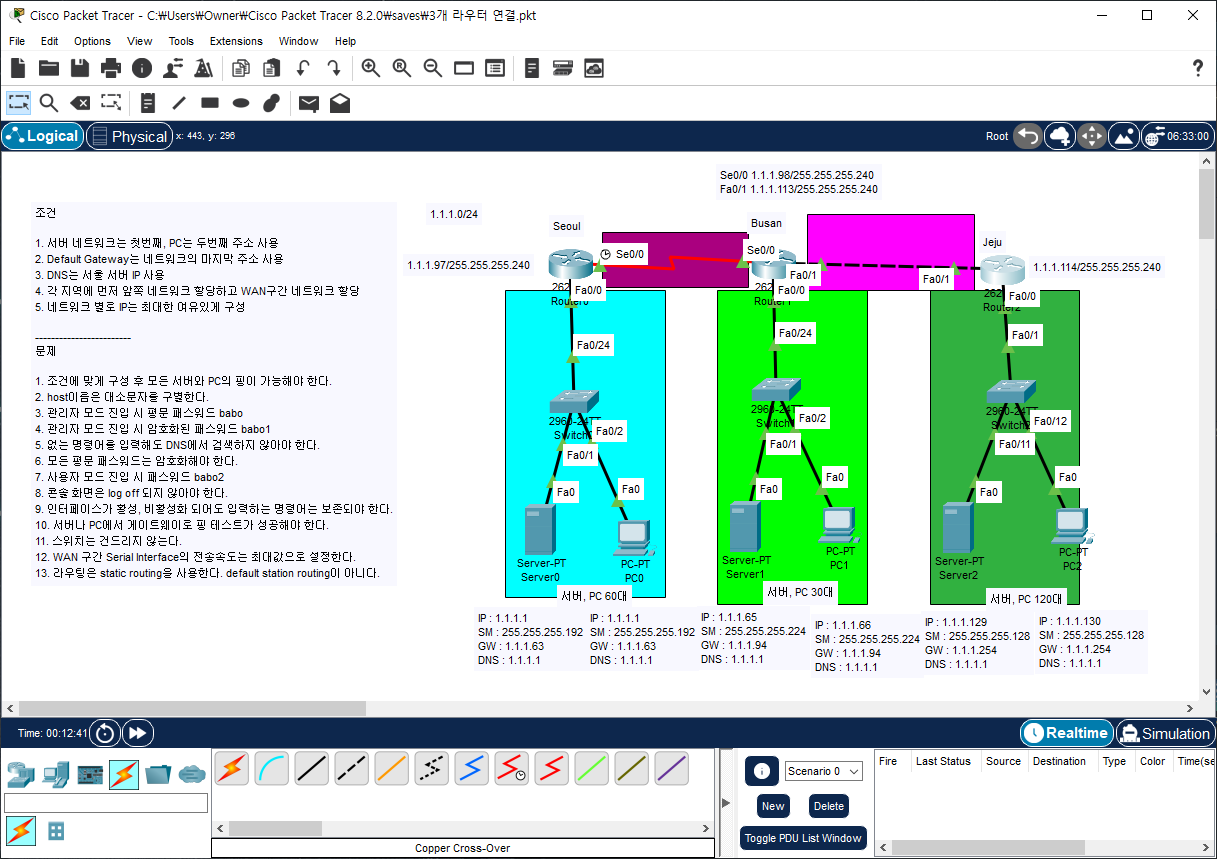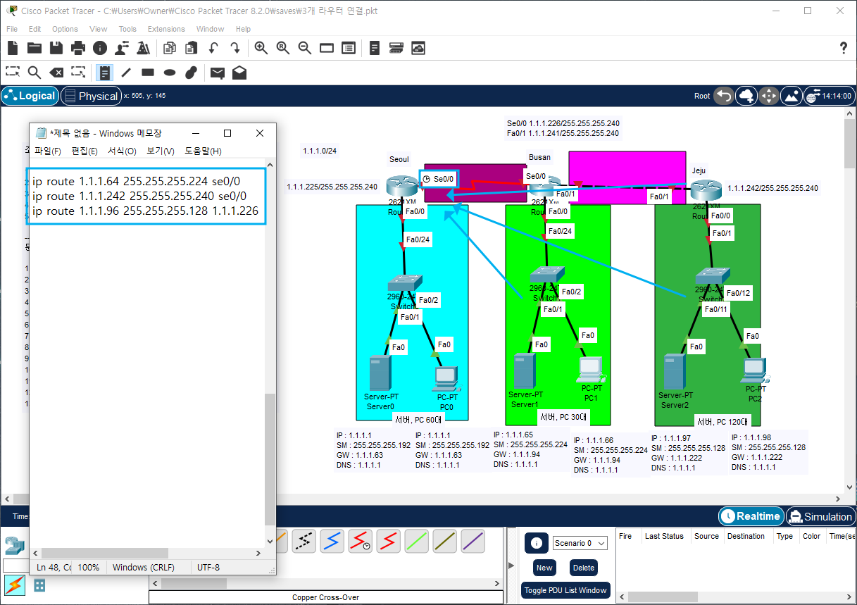 서울의 서브넷 마스크는 255.255.255.192로 62대 수용 가능하고, 부산은 255.255.255.224로 30대 수용이 가능하다. 이번에 추가한 네트워크에는 255.255.255.128로 총 126대가 수용 가능하다. 나머지 라우터끼리의 연결은 255.255.255.240으로 14개씩 수용 가능한 네트워크로 만들었다.