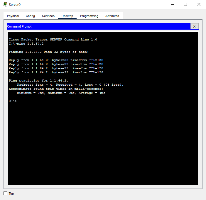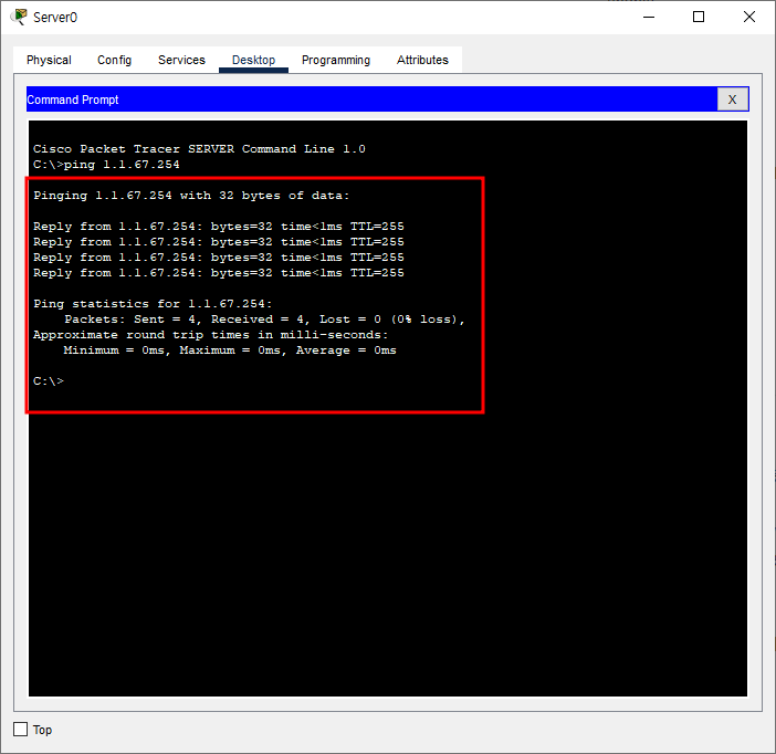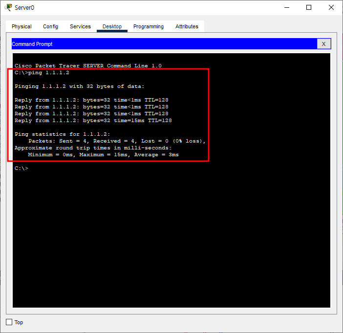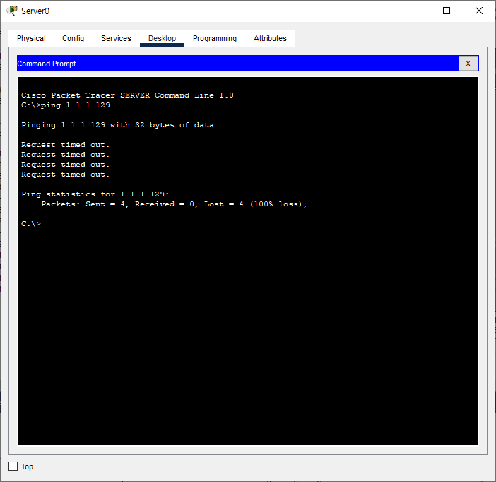 이렇게 명령어를 잘 입력했으니 Ping을 보내보자! 안 보내질 것이다. 열심히 따라와주었는데 미안하다. 하지만 아이피를 주다보면 비일비재하게 일어나기 때문에 오류를 찾는 법도 배워두는 것이 좋다.