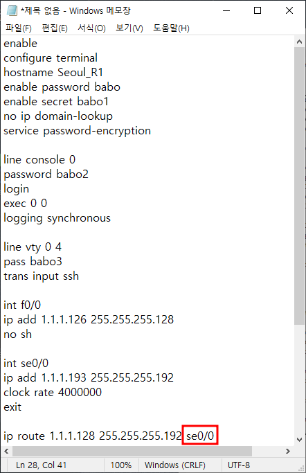 이제 각 위치에서 받은 ip 정보를 입력해줄 시간이다. 서울 기준으로 사진의 서버, PC와 부산 라우터는 직접 연결되어 있어 알고 있으나, 더 멀리 있는 네트워크는 서울 라우터가 모르기 때문에 부산 서버(+PC), 제주 라우터, 제주 서버(+PC) 3가지 정보를 알려주고 여기서 받은 정보는 se0/0포트로 돌려주라는 명령어를 입력할 것이다.