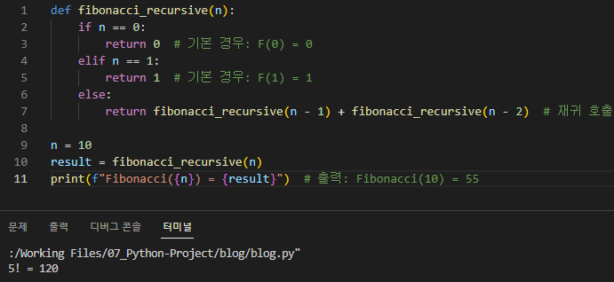 print(f"Fibonacci({n}) = {result}") # 출력: Fibonacci(10) = 55